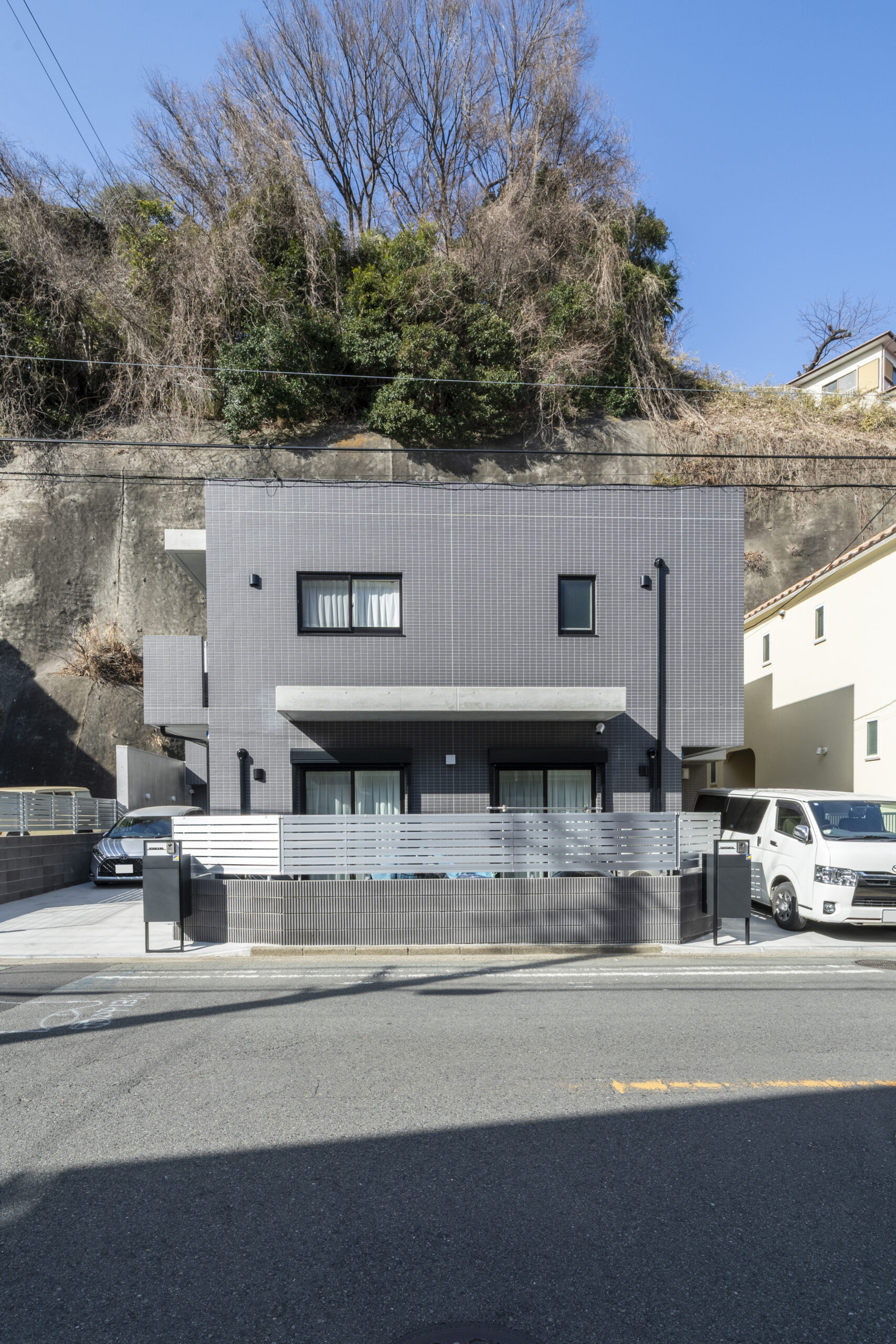 「高低差を、美しき躍動へ。横浜の丘にそびえる、RCコンクリートの二世帯住宅」