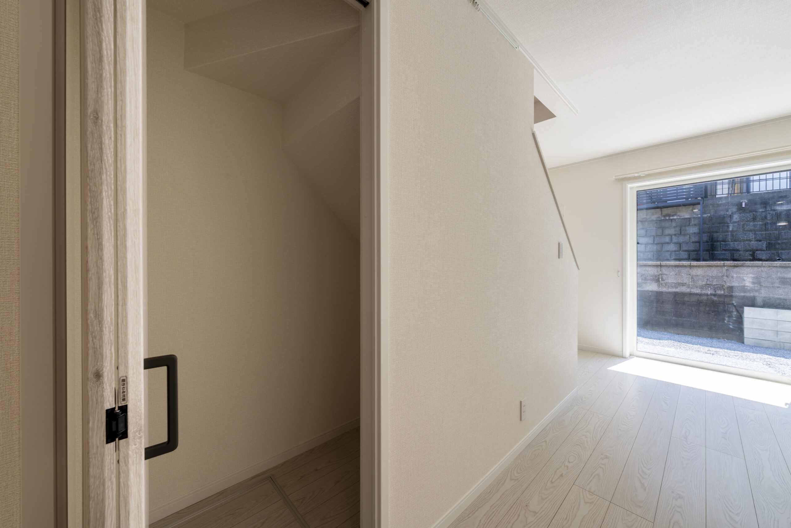主寝室のウォークインクローゼットや、季節物の保管に便利な小屋裏収納など、賃貸の悩みを解決する収納力です。