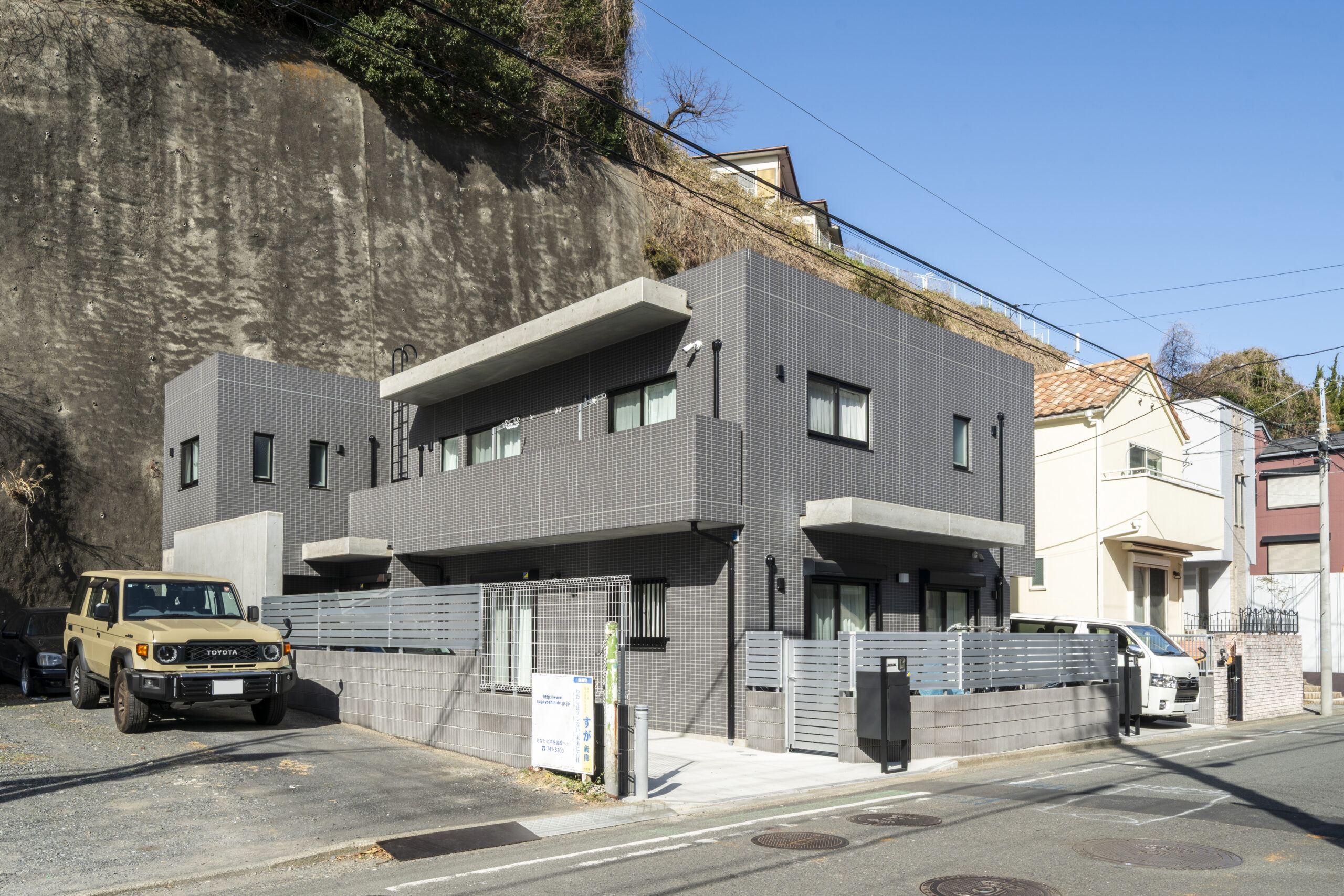 横浜の起伏に富んだ地勢を、邸宅の「誇り」へと昇華させる。土砂災害特別警戒区域(レッドゾーン)という峻烈な敷地条件を、RC(鉄筋コンクリート)構造の圧倒的な強度と、研ぎ澄まされた意匠によって克服した完全分離型二世帯住宅です。