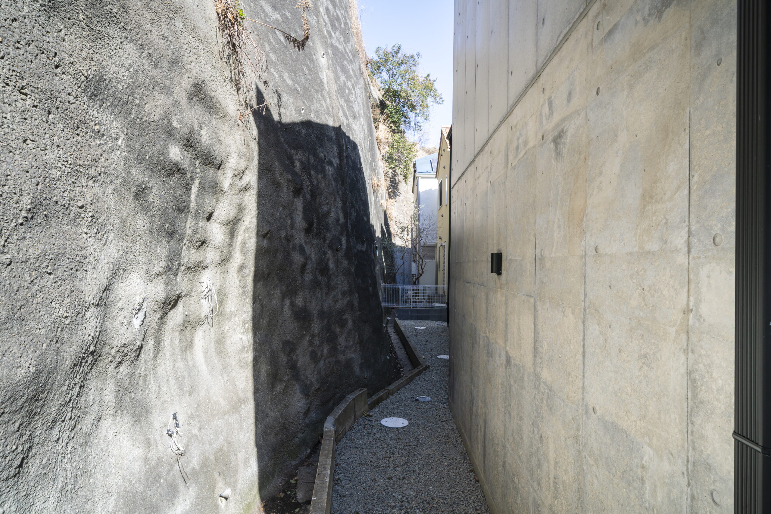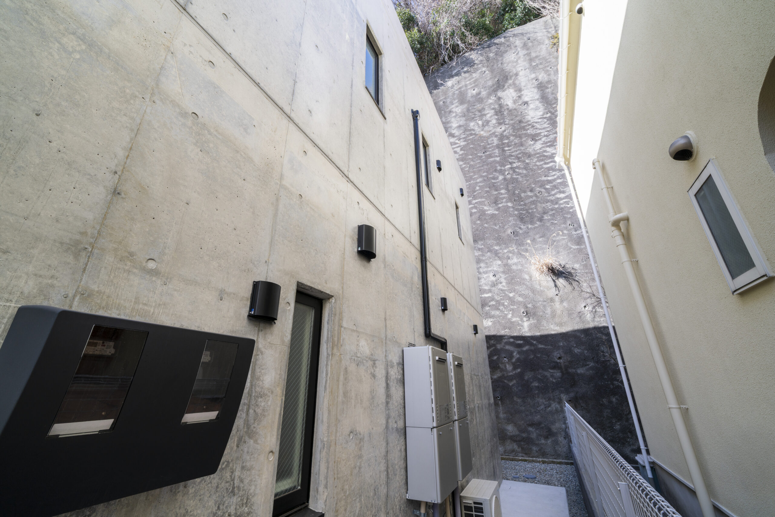 崖地を背負うという制約を逆手に取り、建物そのものを「強固な擁壁」として機能させる。
